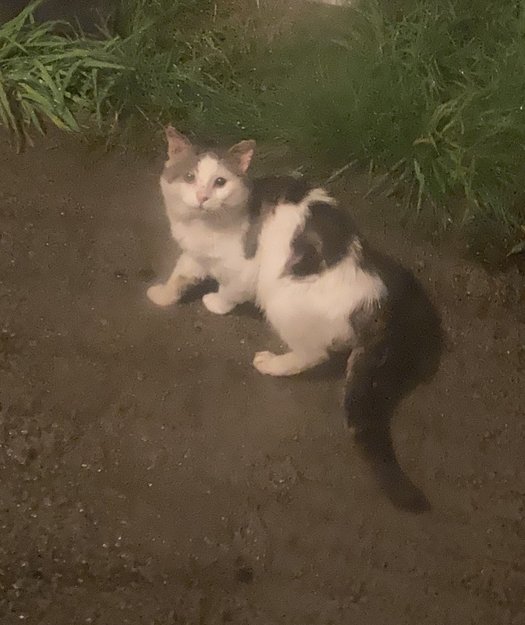 Det er en tilsynelatende hjemløs katt som har ved flere tilfeller blitt observert i hagen min og rundt på Engøy i Stavanger. Den er pjuskete, tynn og ustelt. Fargen er hvit med gråsvarte flekke. Hvis noen vet hvem som eier den ta kontakt.