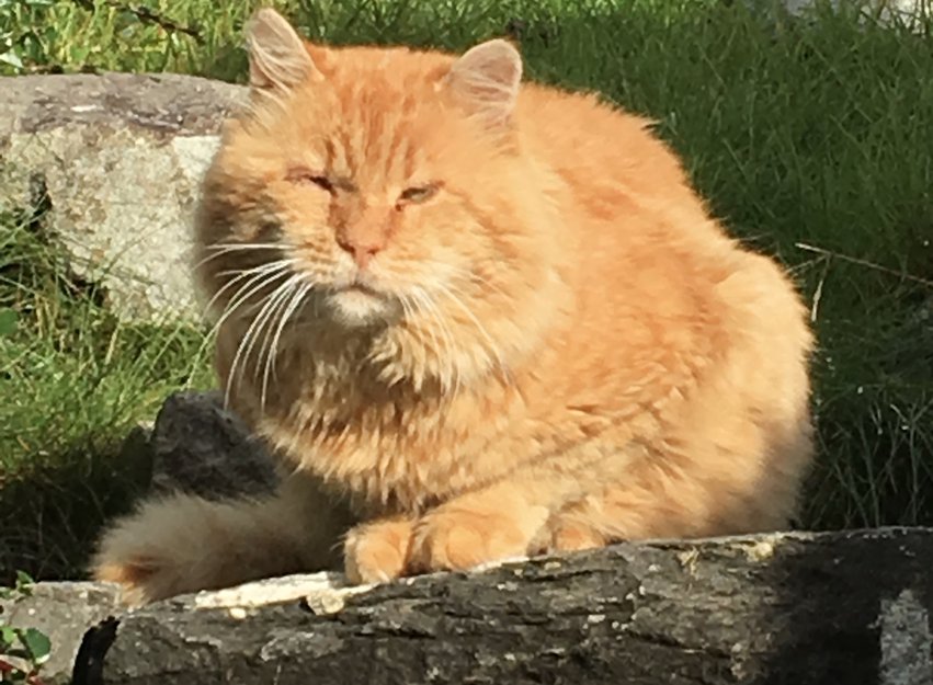 Aslan er en utekatt, og en 'gammel kriger'. Ser du rett på ham, kan det se ut som at hans høyre øye er litt lukket (som på bildet). Han er sky og lar ingen komme innpå seg. Nå har han en fin og tett vinterpels. Langhåret. Skulle han bli funnet skadet, vil man se at alle hjørnetennene er borte. Han har ID-merking, og identiteten bekreftes hos veterinær.
