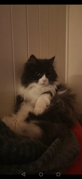 Hun er grå og hvit, langhåret og har ikke hale. Er menneskesky.
