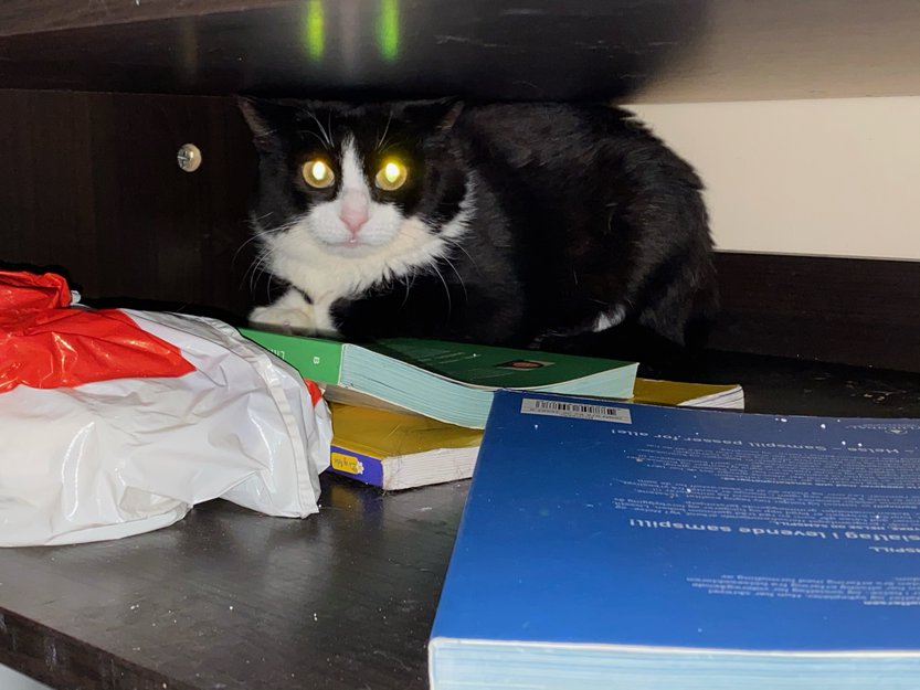 Svart i primær farge men er hvit på brystet og med en hvit trekant i ansiktet. Hun er veldig sky og menneskeredd