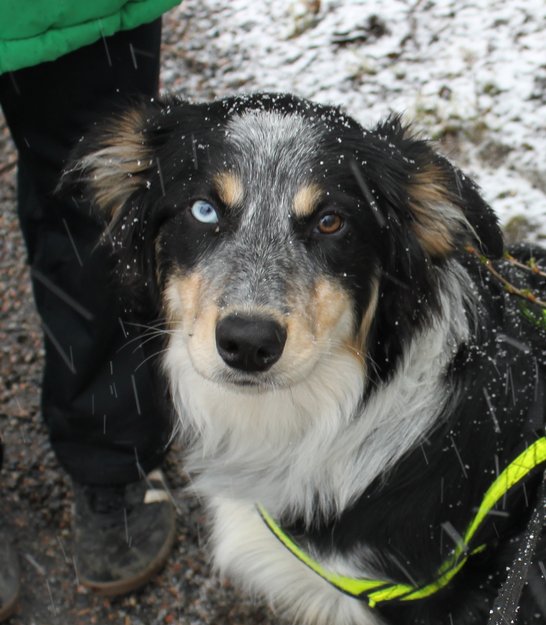 A 7 month old border collie with one a blue right eye and brown left eye.