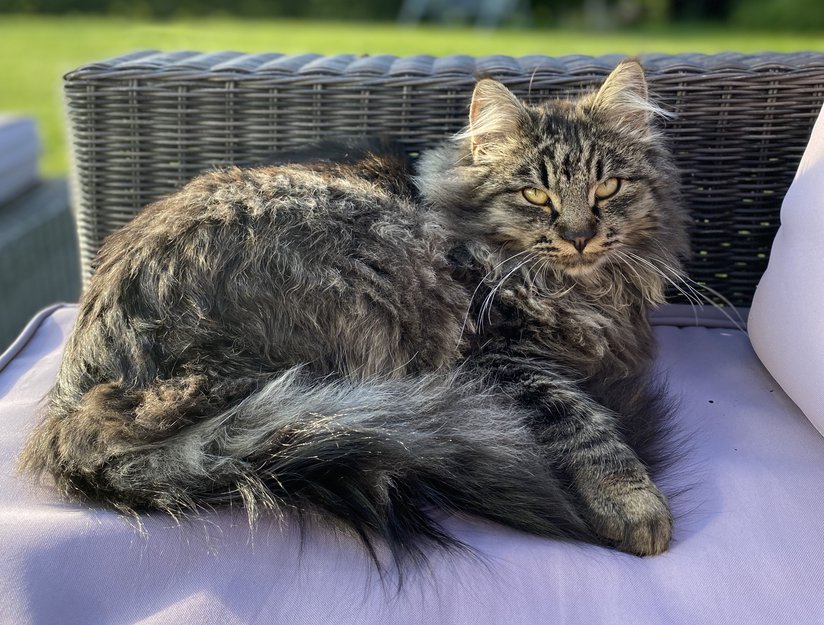 Katten er bare 10 mnd gammel og er veldig tillitsfull og glad i mennesker. Halen er skikkelig stor og flott og han har lang og fyldig pels.