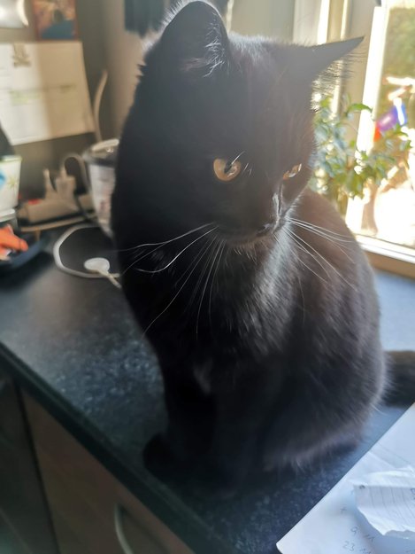 Han er helt svart utennom hvite små prikker på magen og halsen. Han skriker som en babykatt. Og viser når han vil ute hvis han planker med labben sin på vindu eller døra.