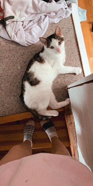 Svart langs ryggen, men helt hvit under magen. Han har også v-formet «lugg» på hodet. Han har en liten knekk på halen, og kanskje litt lenger hale enn normalt.