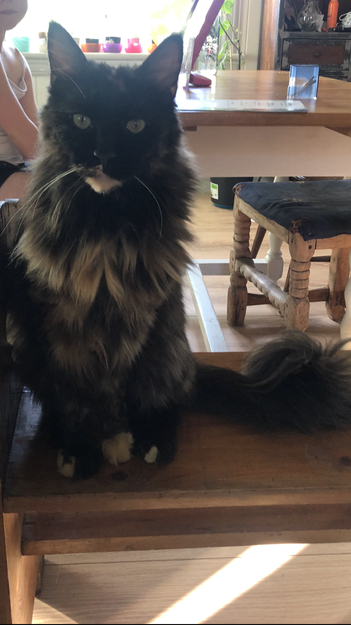 Bella er en lang og tynn maine coon jente på 2 år, ca 5kg. Halvlang pels brun/sort, dusker i ørene.