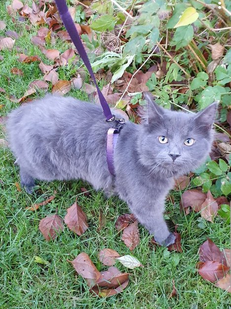 Veldig pen katt, spesiell grå farge. Prater mye og er tillitsfull. Litt redd, særlig høye lyder. Lyder navnet sitt og kommer alltid når jeg roper på han.