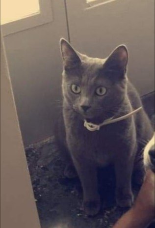 Helt grå katt med grått bånd rundt halsen et flått bånd