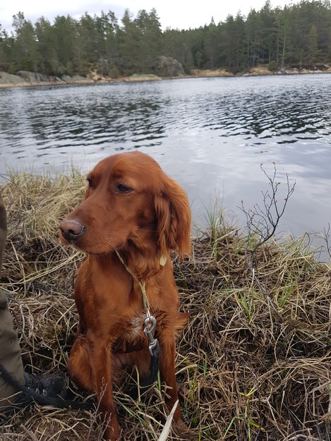 Hunden er liten for rasen. Har en barbert flekk på ryggen og har rødt halsbånd.