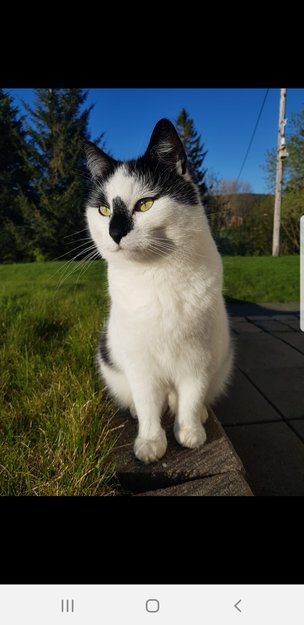 Sort nese, flekkete sort og hvit pels. Ikke chip. Kastrert. Ca 5 kg. Skeptisk til mennesker, lettskremt katt.