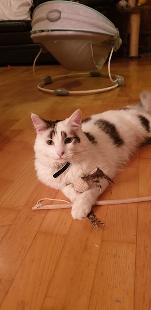 Veldig kosete, sosial,litt rar hale som går rett opp. Han er ganske stor katt mrn ikke tjukk.