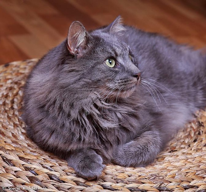 Han er slank og ganske liten. Han er 13 år, men ser ikke gammel ut. Har et lite hakk i det ene øret. Han kommer ofte når vi kaller på han.