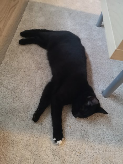 Han har en pote som er hvit akkurat på tuppen. Synes nesten ikke. Husker ikke om det er på begge potene. Han er tykk. Og veldig kosete. Lyder navnet sitt. Og nøkler som rasler. Håper at han kommer til rette.
