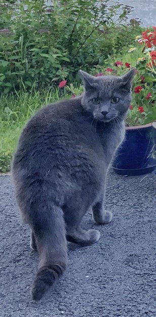 Hakk i høyre øre. Litt hvit på de framste potene. Mjauer mye. Har reflekshalsbånd med bjelle. Litt liten av vekst. Tillitsfull. Chippet.