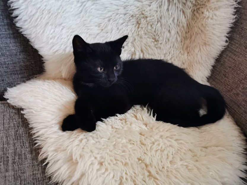 Han ser helt svart ut, men er hvit under på brystet. Ekstremt kjælen og glad i mennesker.