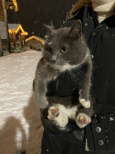 Liten grå og hvit kattunge funnet på Juletregården. Har blitt sett ute der et par dager. Eierne av gården har nå tatt den inn midlertidig.