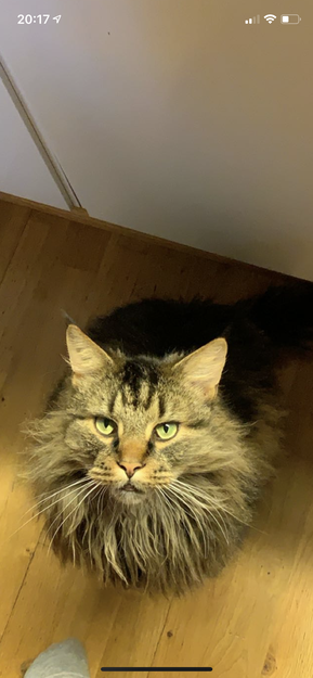 Tyson har lang tjukk pels og får lett floker under magen og under armene. Han har lang fluffy hale og hårtuster på ørene. Bredt snuteparti! Han er STOR! ca 10 kg