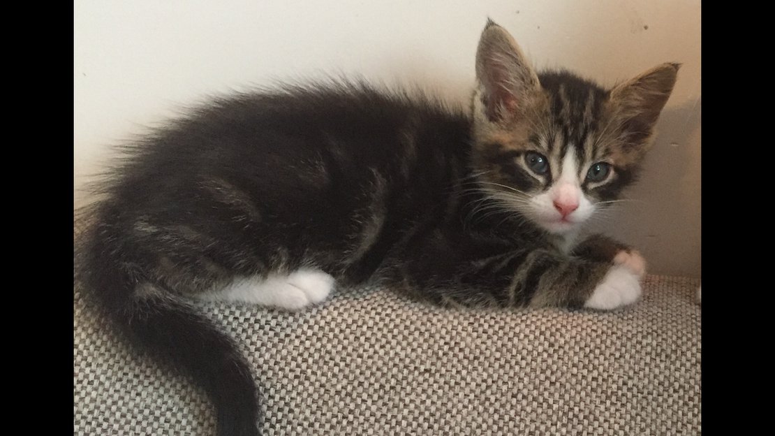 Liten kattunge, hvit pil/stripe på nesa, skjeve øyne