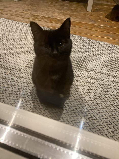 Sort liten katt har vært rundt huset her i flere uker. De siste dagene har den blitt veldig sulten og kontaktsøkende og vil inn. Uredd hund og folk, veldig kosete.