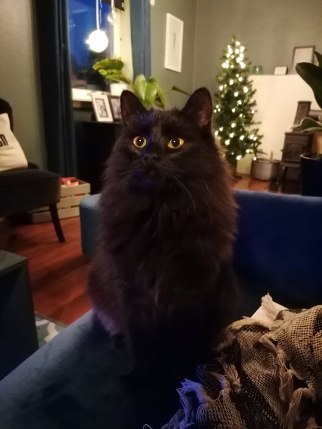 Hun er ikke så stor, og nesten helt svart, men litt brunaktig i noen lys. Hun har lang pels, og ganske fluffy, spesielt halen. Hun har litt maine Coone krage.