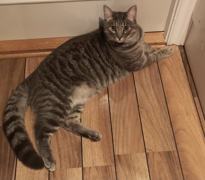 10 måneder gammel gråstripet katt litt sjenert og trives best for seg selv, veldig glad i å utforske nye lukter.