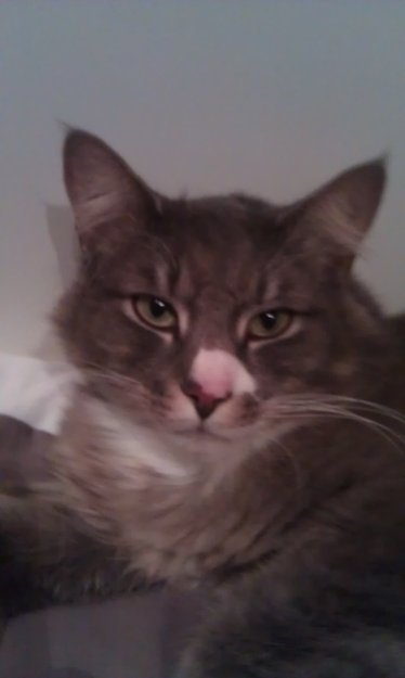 Stor katte, 3 år, halvt skogkatte, noe svart langs ryggen, ellers for det meste grå med noen hvite områder på bryst, mage, poter og en karakteristisk hvit flekk ved nesen.