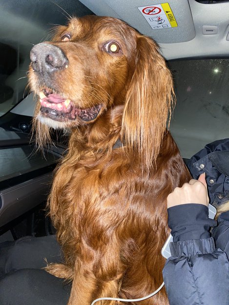 Fant, det jeg tror er en setter, løpende langs E6 og fikk stoppet og tatt den med inn i bilen. Politiet er underrettet.