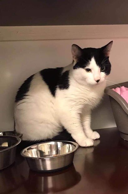 Hvit og sort med sort flekk på nesa. Pus er chippet.