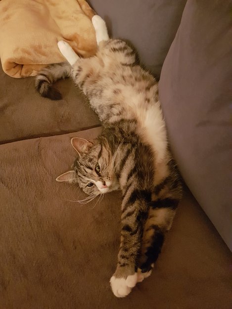 Grå stripete , med hvit halsen og hvite"sokker ".Han er rosa nese med litt svart på venstre side.