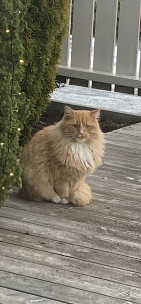 Katten har streifet i nabolaget siden desember. Oppsøker naboer for mat. Er veldig sulten og sky.