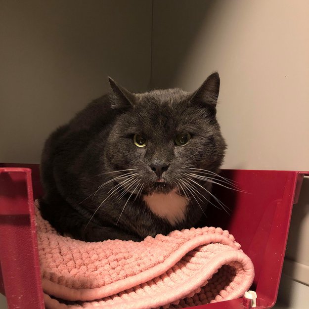 Mest trolig hannkatt, stor katt. Grå og hvit i pelsen. Hvit flekk på brystet og hvit på potene. Har ikke chip. Sky og redd mennesker.