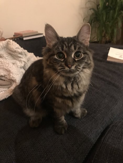 Kattunge på snart 7 mnd. Store øyne og ører. Hvit «kajal» rundt øynene.