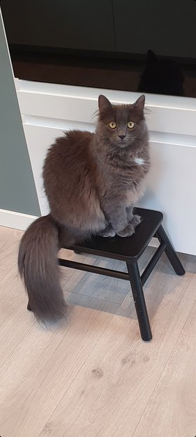 Stor grå katt med hvitt felt på bryst og mage. Er forsiktig og kan være skvetten.