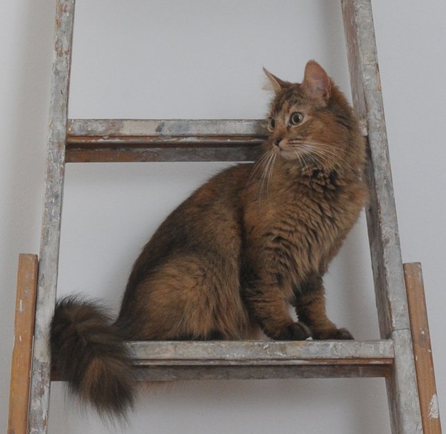 Liten jentepus med lang pels. Sort stripe langs ryggen og rødbrun spraglete ellers. Tigerstripete ansikt. Stor fluffy hale. Veldig kosete og feminin. Sorte, store poter
