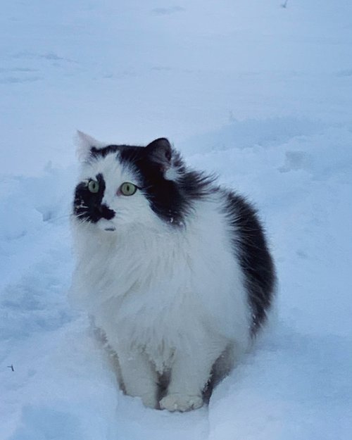 Store runde øyne, sorte avtegn på rygg, hode og fjes. Sort hale. Stor katt med kraftige poter. Helhvit under mage.