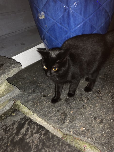 Helt svart, liten ,gule øyne, nylig sterilisert