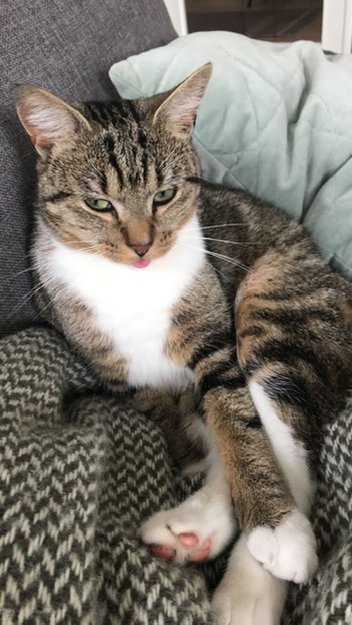 3 år gammel, hunnkatt, gråbrun/sort med hvit pels under. Smal i ansiktet, hvite poter og lange hvite sokker på bakbena.