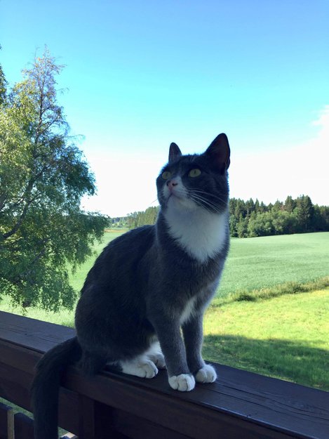 Grå og hvit katt. Hvit på brystet/halsen til over nesen og på potene. Liten svart flekk på nesen.