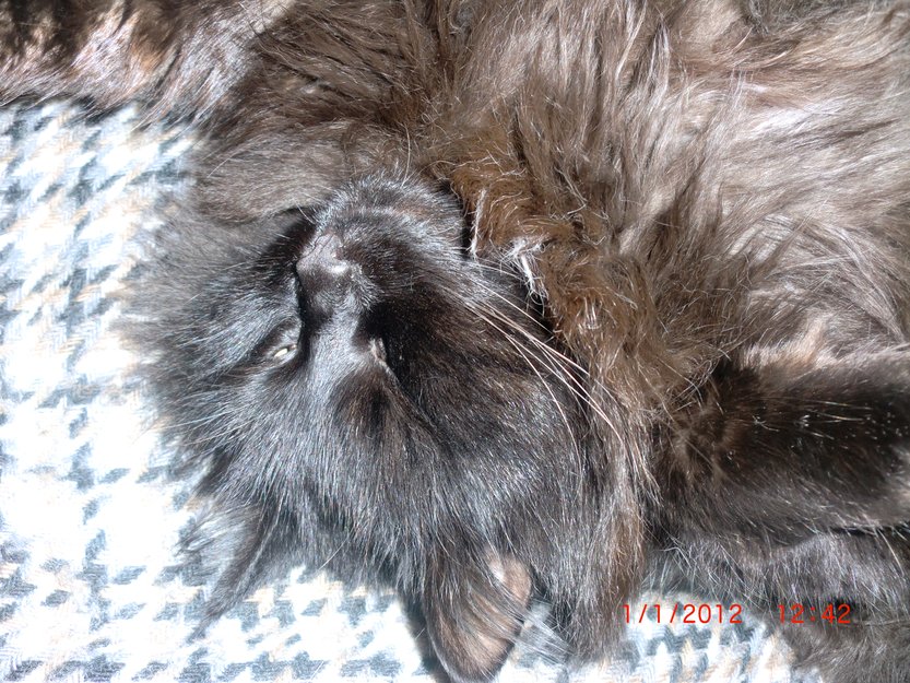 Langhåret med en hvit flekk på halsen. Sort og litt vell tykk.