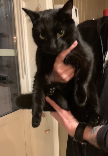 Denne katten har gått her siden nyttårsaften, den er helt svart ,veldig kosete ,tror det er en hann katt ,den er chippet med enten id eller 10 i øret.