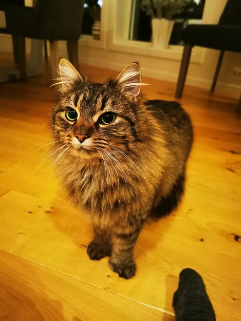 Katten har et lilla halsbånd. Og en ekstra klo.