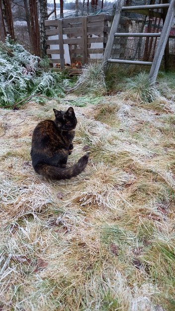 Katten dukket opp i hagen vår. Har vært her noen dager, var tydelig sulten og kald. Naboene har sett denne katten tidligere, men ingen vi har snakket med vet vet som eier henne. Ikke chippet.