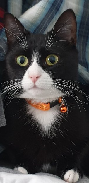 Søt rosa snute omgitt hvitt pelsparti. Ellers svart pels hovedsaklig. Hvite små sokker på frambena, litt lengre hvite sokker på bakbena. Mulig at hun er uten halsbånd, da hun mister de ofte.