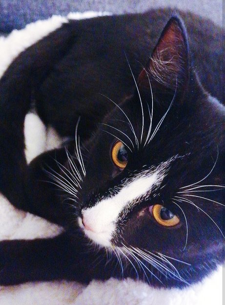 Svart med hvite poter og hvit på hals og nese. 1 år gammel. Sosial katt