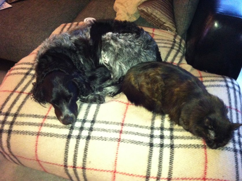 Mellomlang pels, mest svart med brune spragler.