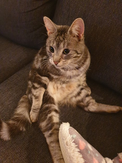 Sort og grå spraglete , har en spesiell krøll på halen som gjør at den ruller innover kroppen hans.