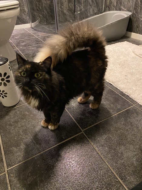 Funnet ved Sola skole. Har vert ute hele dagen å følger etter flere mennesker. Det skal bli veldig kaldt i natt og katten er nå hos meg inntil videre. Hun er veldig kosete og snill, var veldig sulten og tørst når hun kom til meg. Har en veldig karekteristisk hale som er lett å kjenne igjen:) Denne katten har garantert et hjem. Ta kontakt om du drar kjensel på katten:)