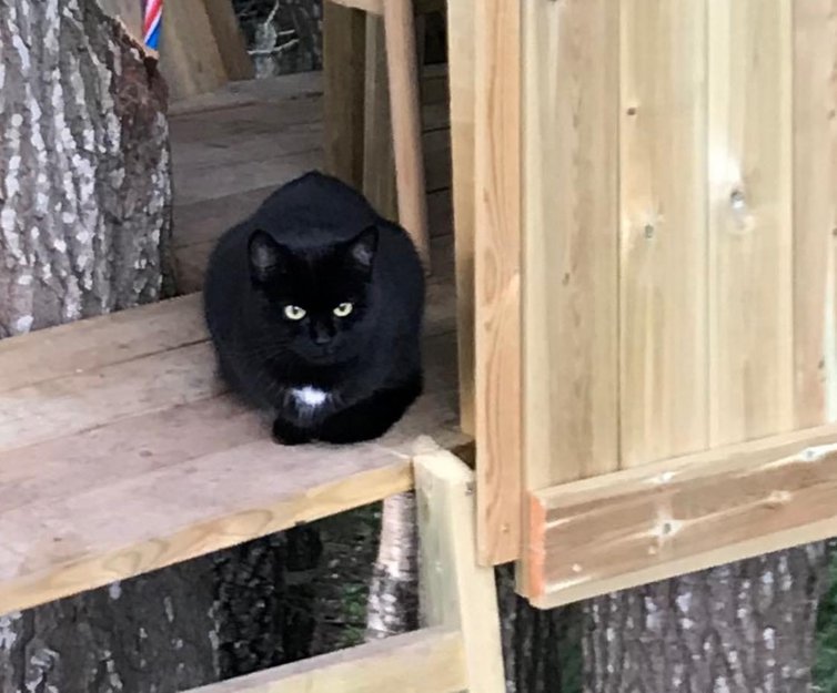 Sort, liten katt med hvit flekk på brystet. To år gammel.ventelig og uredd.