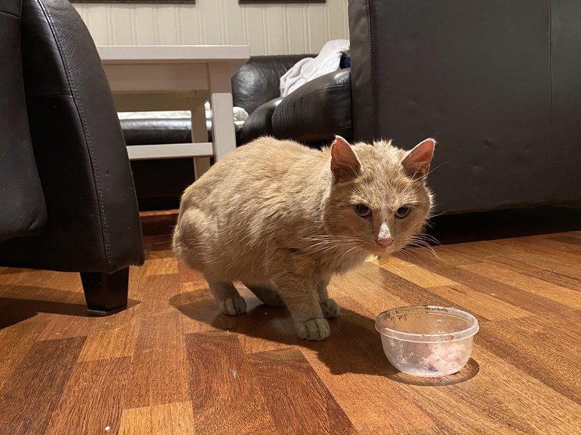 Funnet i garasje som vi går ut/inn av flere ganger daglig. Tynn og mager/utsultet. Kjælen og maler. Halen er av - ser ut som det har skjedd nylig/stor skorpe. Møkkete. Tatt inn nå kl 23. Knyttet til raset i Gjerdrum (nabokommunen)?