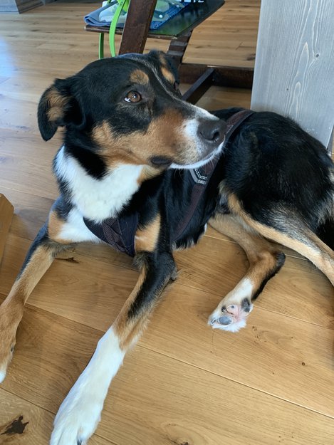 Tricolor med hvit flekk på nakken. Har på trekksele. Tillitsfull.