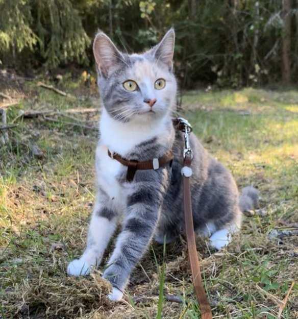 Hun er nesten 2 år. Hvite poter og hvit mage/hals. Hun er tam, kjælen og glad i mennesker. Hun kommer med en gang man roper Luna. Hun er redd/skeptisk til andre dyr som hunder eller andre katter.
